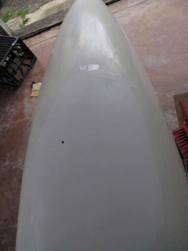 The large whiter area is new flow coat along with a few small patches of still wet coat where the glass began to show through. The old coat is in bad shape which makes it almost impossible to neatly blend the new layer. |