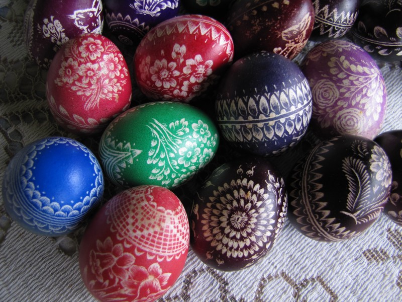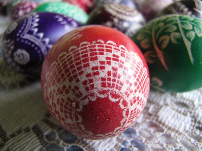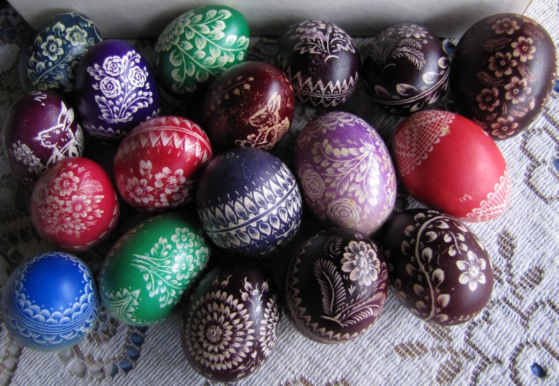 In her younger days mum used to make German style Easter eggs. These are dyed chicken eggs which are then scratched using a tool (modified triangular file).